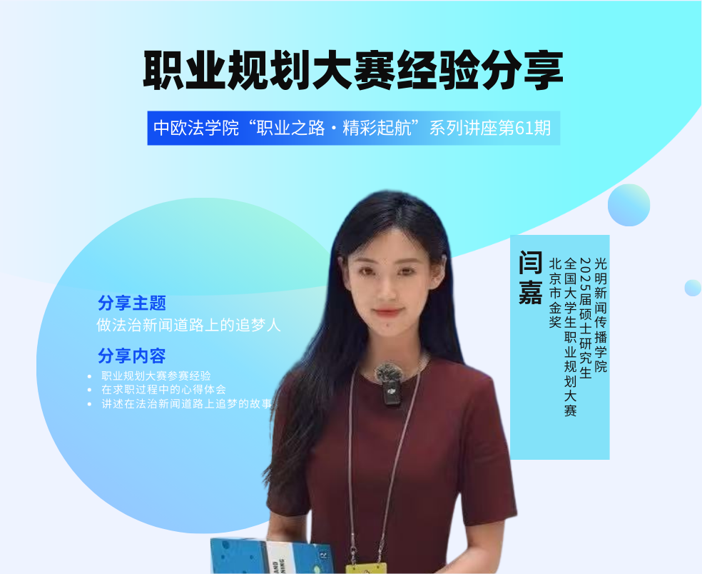 2025年11月20日,光明新闻传播学院与中欧法学院联合举办职业规划大赛经验分享暨第61期“职业之路·精彩起航”系列讲座。光明新闻传播学院2025届硕士研究生、全国大学生职业规划大赛北京市金奖得主闫嘉就职业规划大赛经验和求职技巧与感悟与同学们做了分享。讲座伊始,闫嘉阐述了职业规划大赛的意义与核心,指出竞赛是个人成长历程的总结,能聚焦于个人特质和发展路径,帮助审视和锚定未来,并就参赛过程中PPT制作的核心原则和... >>>