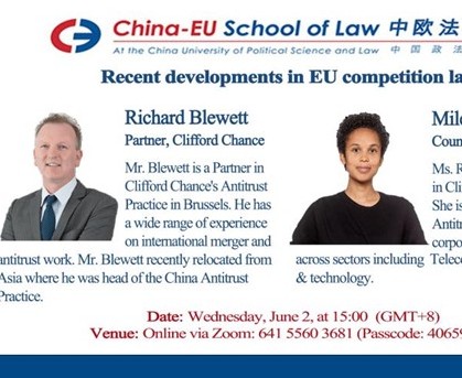 2021年6月2日,中欧法学院北京选修课涉外法律实务前沿讲座第六讲成功举办。此次讲座由来自知名外所高伟绅律师事务所的合伙人Richard Blewett和资深顾问Milena Robotham担任主讲人,中欧法学院欧方执行院长Monty Silley担任主持人。讲座主题为欧盟竞争法的最新发展”。中欧法学院合伙人办公室Griselda Qosja亦出席本次讲座。本此讲座内容包括欧盟竞争法概述、政策要点、合并控制的最新发展、《欧盟运行条约》第101和102条的实施... >>>