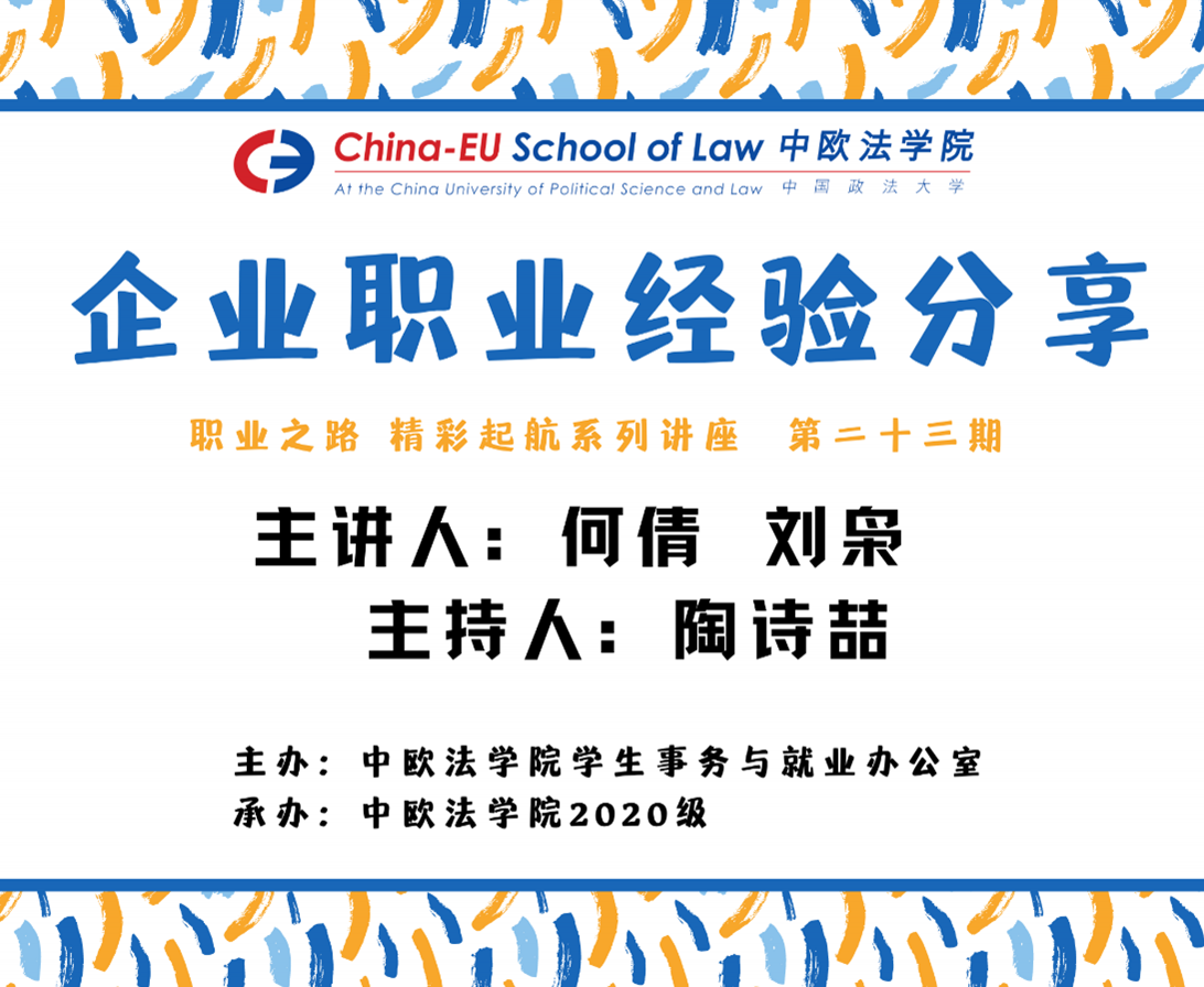 2021年5月25日,中欧法学院线上举办了 “职业之路,精彩起航”系列讲座第23期——“企业职业经验分享”,本次分享会邀请到中欧法学院2009级校友何倩、2015级校友刘枭带来企业求职的经验分享,吸引了近百名同学前来聆听交流。何倩校友现就职于中国天辰工程有限公司,任法律合规部部长;刘枭校友现就职于中国进出口银行法律事务部(资产保全中心)。何倩校友从三个方面分享了自己求职和工作的经验。首先,她从自己当年的求职历程... >>>