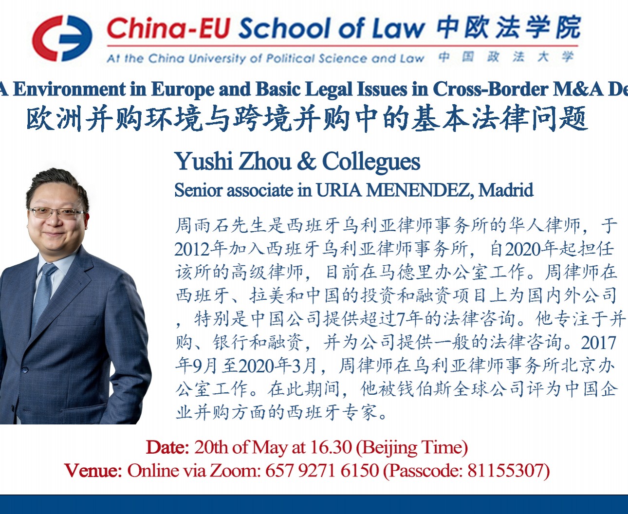 2021年5月20日,中欧法学院北京选修课涉外法律实务前沿讲座第五讲成功举办。此次讲座由来自西班牙乌利亚律师事务所(Uría Menéndez)的华人律师周雨石与他的团队成员Rodrigo López Checa,Miguel Reina Hemando担任主讲人,中欧法学院欧方执行院长Monty Silley担任主持人。讲座主题为欧洲的并购环境及跨境并购中的基本法律问题。中欧法学院合伙人办公室Griselda Qosja亦出席本次讲座。在讲座的开始,周律师简单介绍了乌利亚律... >>>