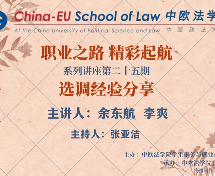 2021年11月27日,中欧法学院线上成功举办以“选调经验分享”为主题的“职业之路,精彩起航”系列讲座第二十五期。本次讲座邀请到中欧法学院2021届双硕士毕业生余东航为学院带来选调经验分享。余东航是云南省2021年选调生,现就职于云南省某省直单位,曾获得中国政法大学“优秀毕业生”等荣誉称号。此外,中欧法学院辅导员李爽老师还分享了自己负责选调生就业工作的心得和经验,共计150余名同学聆听了本次讲座。(余东航 校友)... >>>