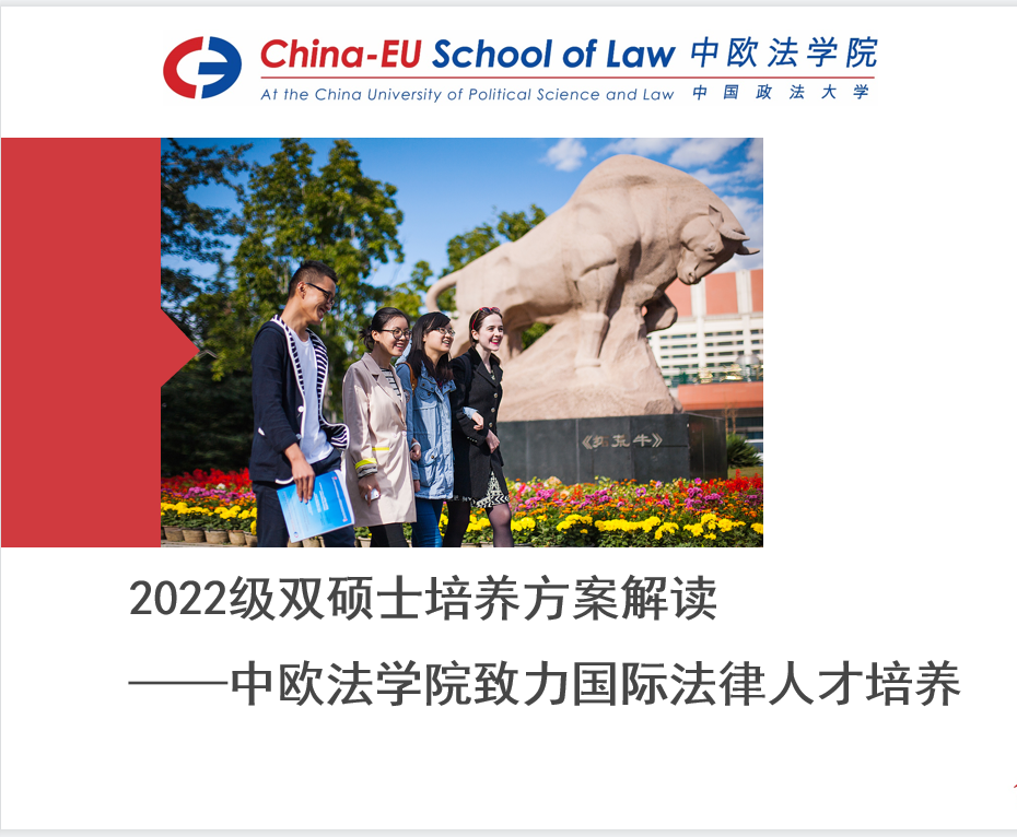 为解决2022级双硕士新生对未来学习生活的困惑,中欧法学院举办了“2022级双硕士培养方案解读会”。由于疫情影响,本次会议通过线上形式召开。会上,中欧法学院教务办公室主任马安娜老师、教务秘书吴素跃老师分别从“高端涉外法治人才培养的国家战略需求以及回应路径”、“中国政法大学中欧法学院涉外法治人才的培养情况”、“2022级双硕士培养方案”、“学习常见问题及提醒”四个方面做出了讲解和介绍。首先,马安娜老师介绍了... >>>