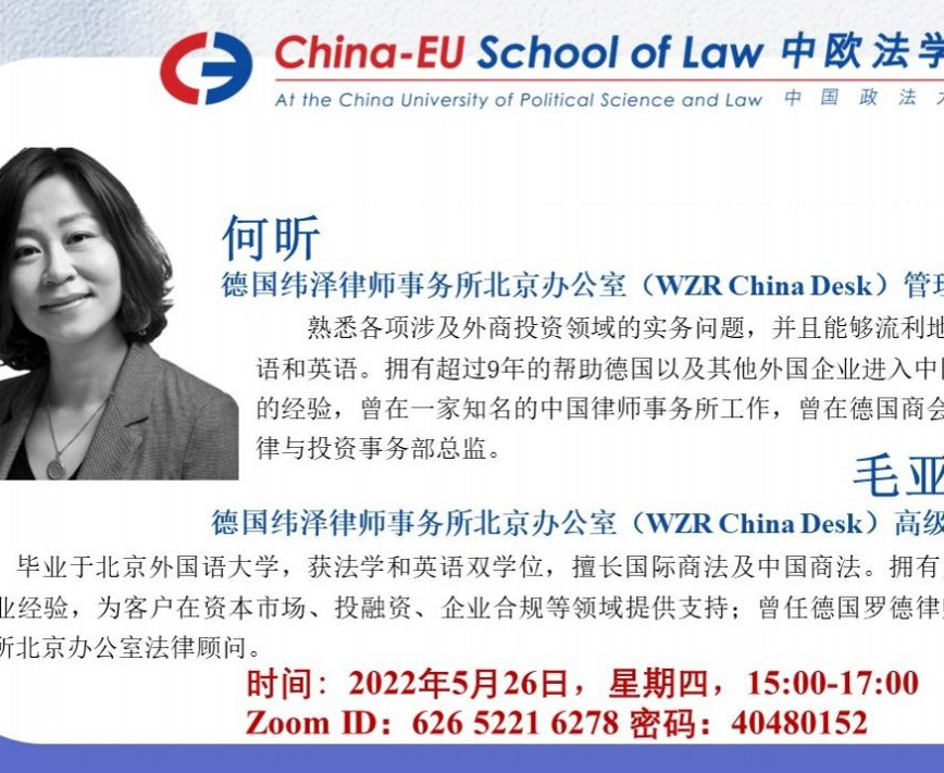 2022年5月26日下午三点,中欧法学院2022年国际法律实务前沿讲座第四讲通过zoom会议在线举行。德国纬泽律师事务所北京办公室管理合伙人何昕和高级顾问毛亚慧,受邀为中欧法学院的同学们讲解外商投资及个人信息保护领域相关法律问题。讲座伊始,何昕律师首先展示了2021年中国欧盟商会、中国德国商会的商业信心调查。尽管受到新冠疫情的影响,欧洲企业在华投资的信心反而增加了。一方面和我国疫情防控取得的成效有关,另一方面也... >>>