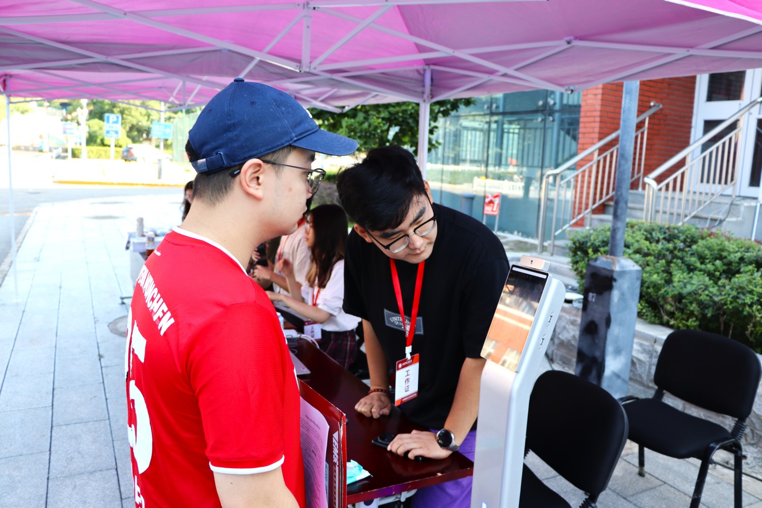 早上8时起,新生们陆续抵达报到现场。在志愿者的引导下,同学们依次办理人脸识别、系统报到、材料提交、物资领取等报到手续。现场设置的咨询台前,志愿者耐心解答着关于课程设置、校园生活等各类问题,贴心周到的服务让新生们感受到中欧法学院大家庭的温暖。