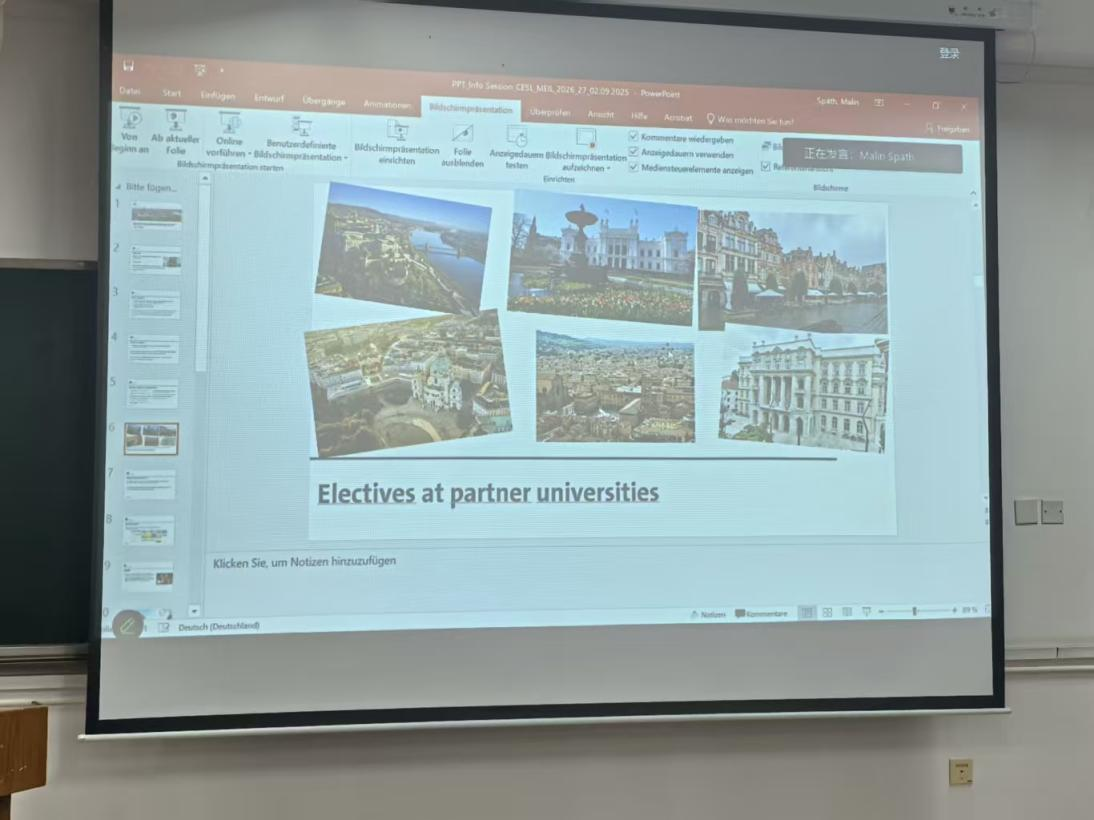 Malin Späth就赴欧学习的具体安排及其申请流程进行了详细说明,涵盖了重要时间节点、课程选择、APS审核、签证办理及住宿安排等关键事项。此外,她还对合作院校的课程资源与师资团队进行介绍,以帮助同学们提前规划学业路径。