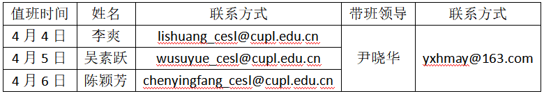 2024年清明节假期期间,中欧法学院值班安排如下: