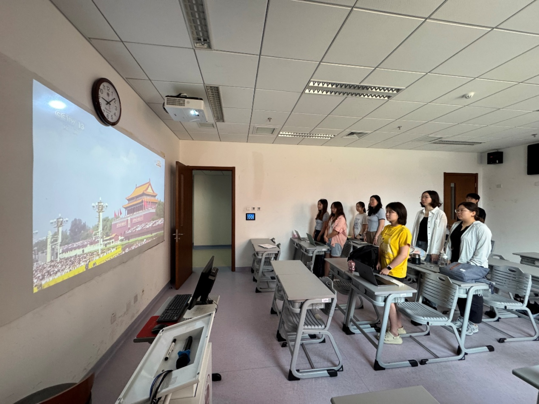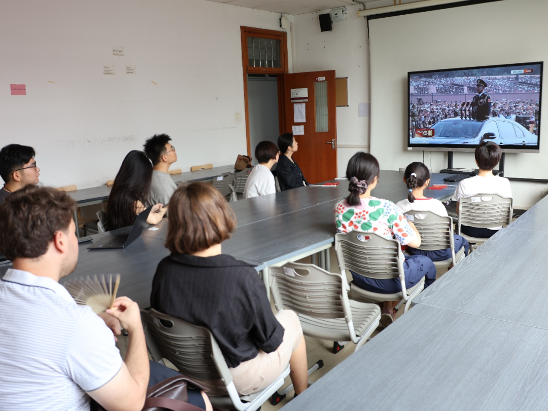 在观看组织过程中,全院师生在不同校区与年级之中,形成了有序且丰富的观看场景:学院教师与部分2024级双硕士同学在明法楼412教室集中观看英文直播,现场特别邀请两位留学生同学共同参与,通过国际视角同步感受这一历史时刻,增进中外师生对历史记忆的共鸣;2025级双硕士新生集中在昌平校区端升楼第一阶梯教室观看;2023级双硕士同学则在海淀校区以班级为单位集中观看;部分2024级双硕士同学虽身处德国,仍通过网络直播积极参与,即便远隔重洋,依旧心系祖国,与全院师生共同见证这一具有重大历史意义的纪念活动。