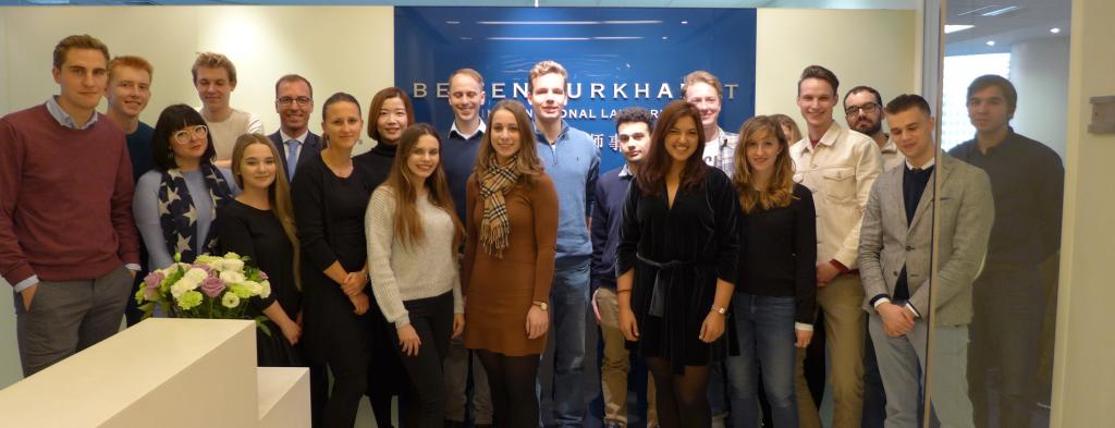 第一个是德国百达律师事务所(Beiten Burkhardt)北京代表处。第二个是中国安杰律师事务所。参观律师事务所的目的是让国际学生了解北京律师的工作及生活情况。此外,同学们也有机会学习中国法律实务,包括中外合同的重点,外国投资许可的过程和跨境争端解决机制等。
